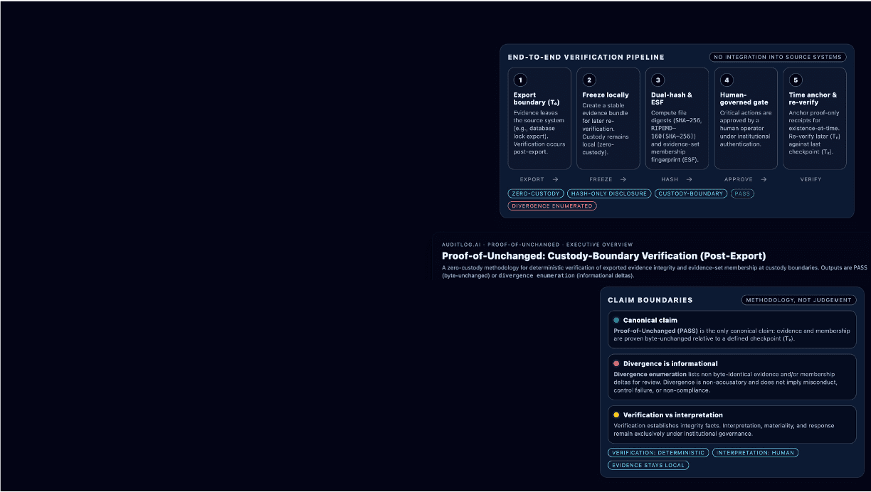 Verification establishes integrity facts. Interpretation, materiality, and response remain exclusively under institutional governance.